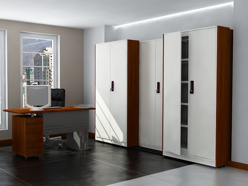 از قبیل : قفسه بایگانی ریلی مکانیکی، قفسه بایگانی ریلی برقی، قفسه ریلی هوشمند بر روی ریل ها جا به جا میگردند و در واقه راهروها تبدیل به یک راهرو متغیر در بین کابین ها می شود.